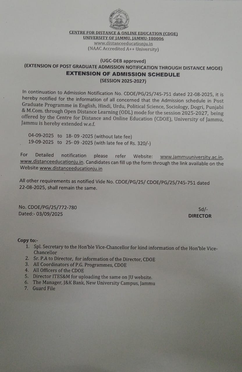 ADMISSION NOTIFICATION FOR POST GRADUATE PROGRAMMES (NON-CBCS) IN ENGLISH, HINDI, URDU, POLITICAL SCIENCE, SOCIOLOGY, DOGRI, PUNJABI & M.COM SESSION 2025-27. (31/7/25) |
