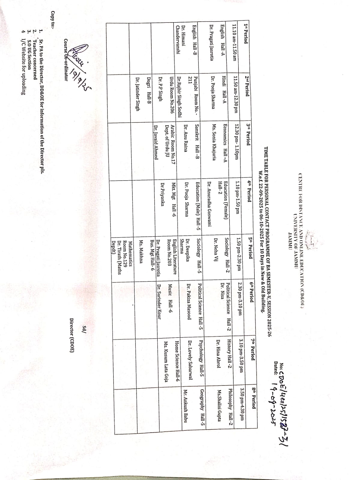 Notice and Time table for Personal Contact Programme of BA Ist semester session 2025-26 |